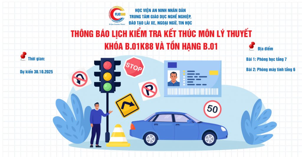 * Lưu ý: Học viên mang theo giấy tờ tùy thân còn hiệu lực hoặc VNeID định mức 2; Sau khi kết thúc kiểm tra lý thuyết, học viên xuống tầng 1 đăng ký làm thẻ DAT.